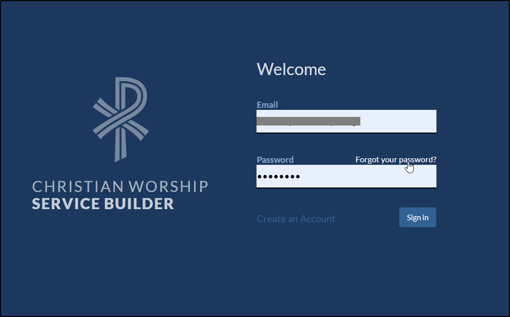 How do I reset my password? [FAQ] Follow Kimberly Moon October 27, 2022 13:01 Go to Christian Worship: Service Builder. Click "Sign in" in the upper right corner. Click "Forgot your password?" and fill in your email Find the email received and follow the link and instructions to reset your password.